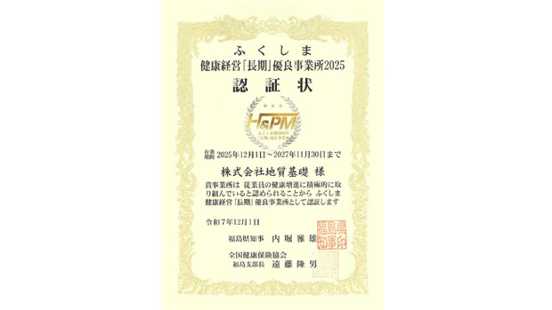 当社は、従業員の健康づくりに関する取組を継続的に実践してきたことが認められ、福島県が推進する「ふくしま健康経営「長期」優良事業所2025」に認証されました。