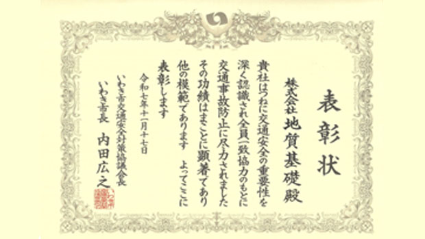 一般社団法人福島県地質調査協会創立50周年を迎え、本協会より感謝状をいただきました。